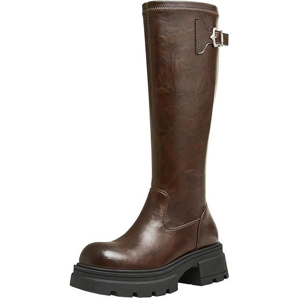 天美意复古厚底增高骑士靴长靴女时装高筒皮靴冬新款KTX15DG4
