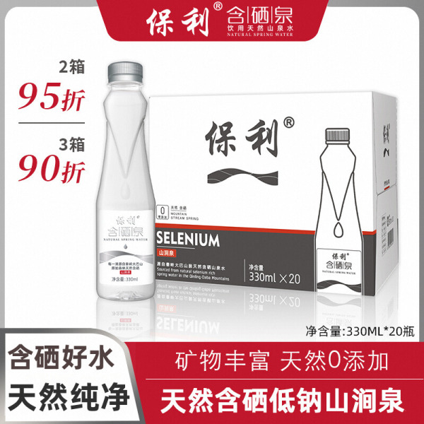 【330ml*20瓶29.99,折1.5/瓶】源自秦岭高山脉,中科院合作天然含硒山泉水,寒武纪深沉矿岩,含硒偏硅酸低钠,矿物丰富,0糖0脂天然0添加,一口清甜清爽,健康的水放,放心的喝~