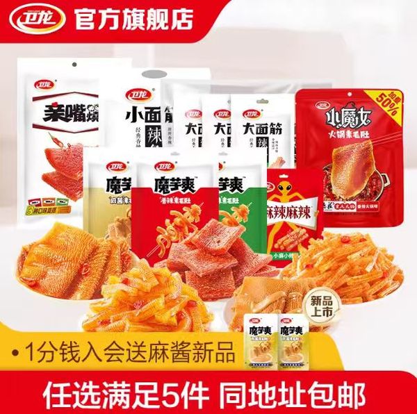 任选⑤件 卫龙•爆款零食合集 (选3个以上不同选项,价格成立) 到手蕞多3斤,折6.3亓/斤! 有大面筋小面筋和魔芋爽,小时候的味道! 一吃就停不下来!!香香辣辣超过瘾!
